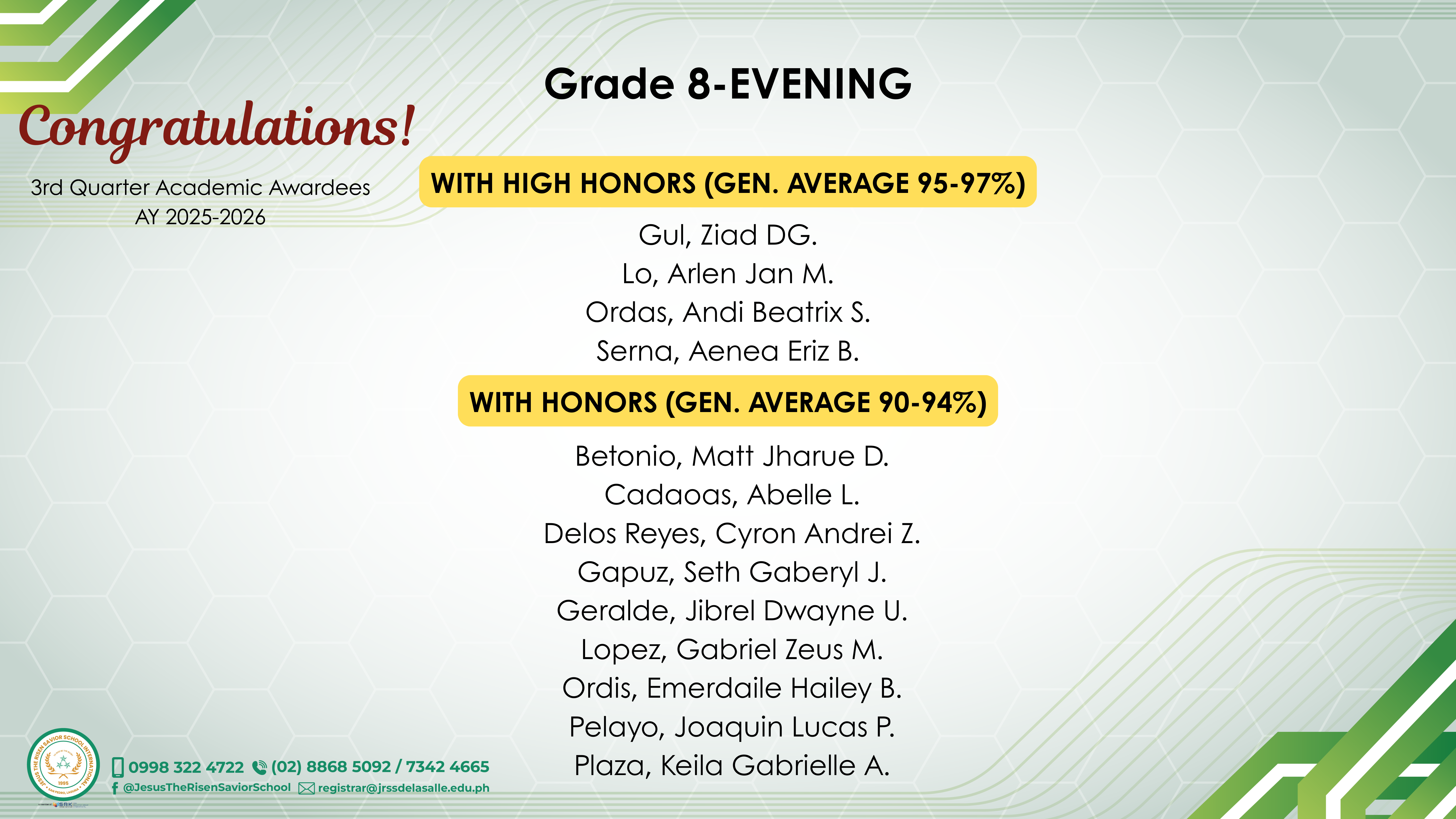 Grade 8 - Evening Class Awardees